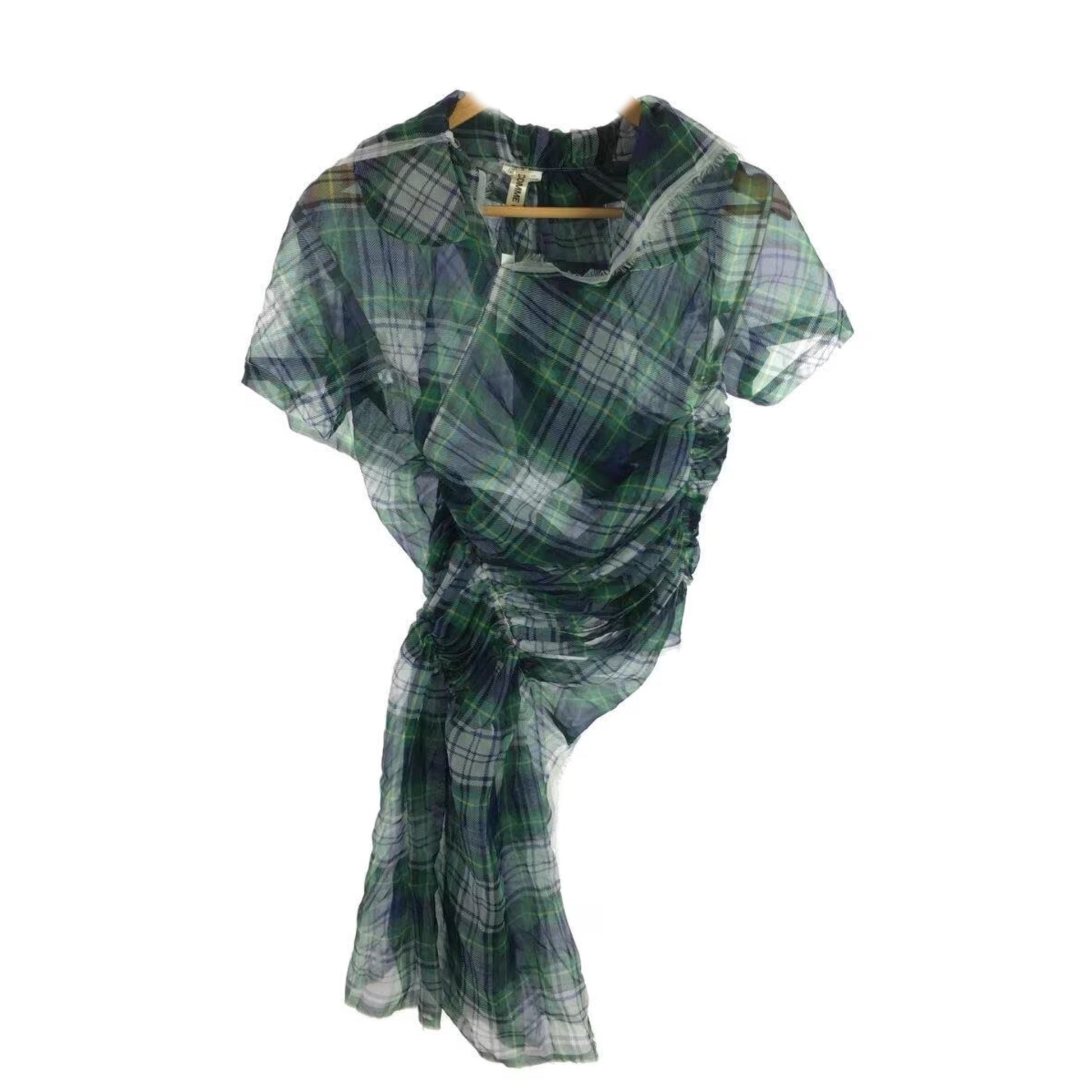 Comme Des Garcons Tartan Assymetrical Peter Pan Collar Ruched SS Blouse