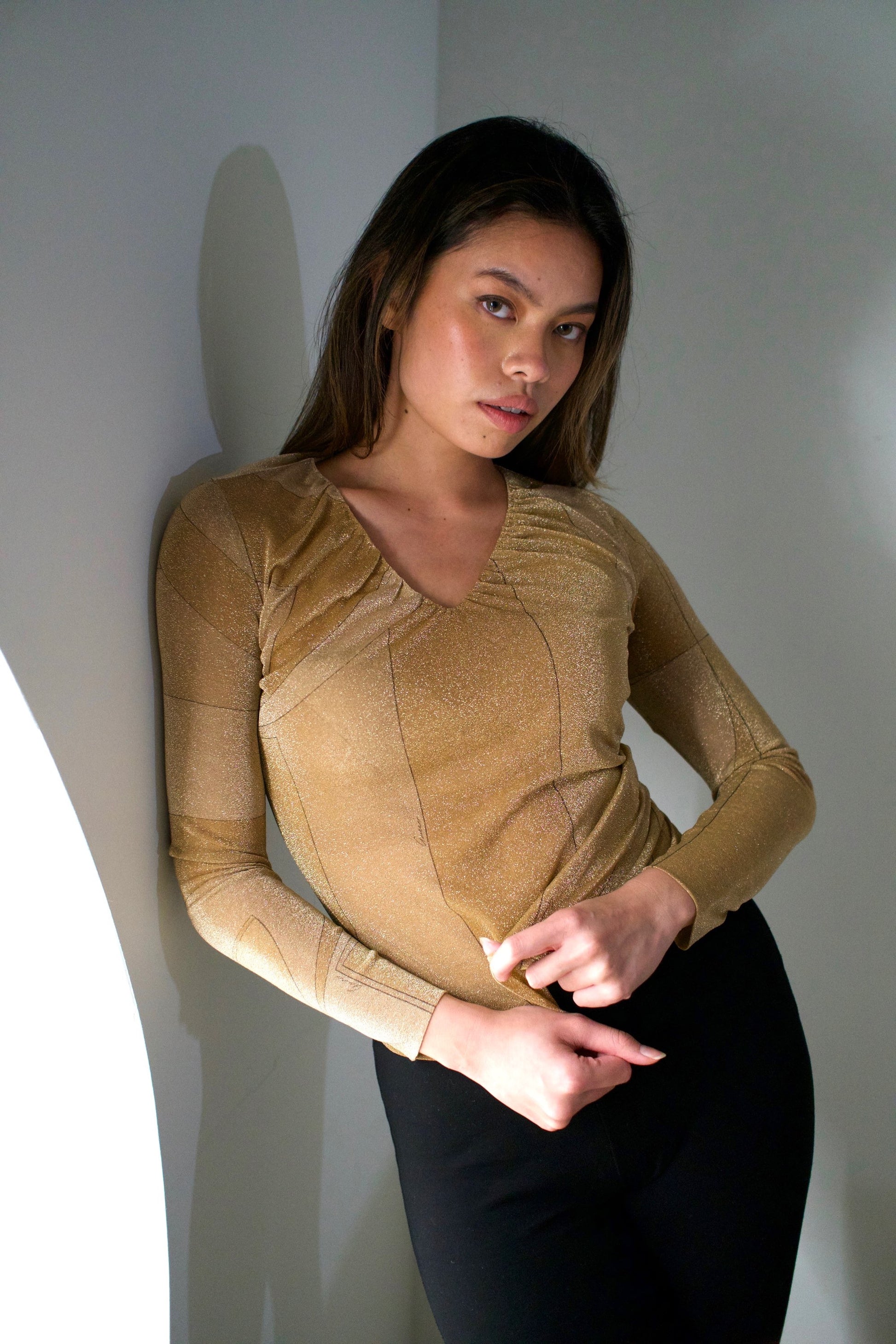 Gucci by Tom Ford Lurex Glitter V Neck LS Abstract Top Gold
