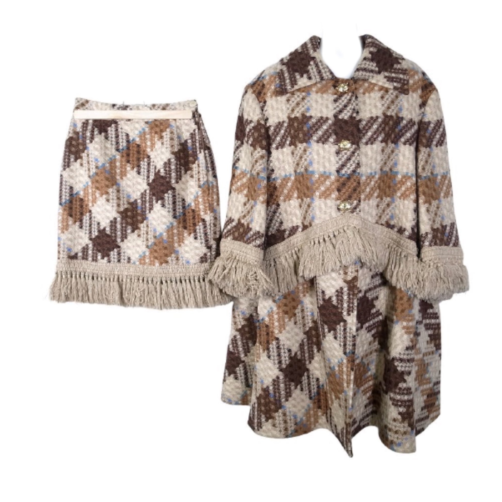 Valentino Boutique Tassel Trim Pixelated Checkered Wool Tweed Coat Skirt Set